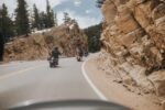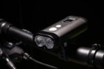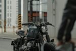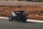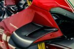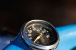 Close-up of a blue motorcycle’s dashboard and fuel tank.
